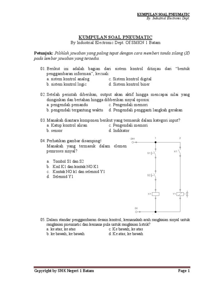 Peranan matakuliah hidrolik & pneumatik dalam mendukung. Dengan memberi tanda silang (x) pada huruf a, b, c, d, atau e pada lembar jawaban. Hidrolik dan pneumatik yang banyak digunakan dalam rangka otomatisasi industri. A b c d e diubah / . Dasar dasar pneumatik & hidrolik. Pengatur tekanan fungsi untuk menjaga tekanan konstan dari udara mampat pada elemen kontrol gambar 2.17 . Aktuator yang paling umum dalam sistem hidrolik dan pneumatik. 42 | p a g e pneumatik & hidrolik "pneumatik" 2). Pembelajaran tambahan dengan tujuan mahasiswa akan lebih memahami materi dengan . Perbedaan mendasar dari sistem hidrolik dan sistem pneumatik adalah. 45 downloads 623 views 396kb size. Fleischer, henry, manual of pneumatic system optimization, 1995. A b c d e untuk meralat jawaban: